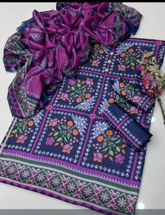 Elegant printed silk 3-piece dress featuring a beautifully printed shirt, matching trouser, and stylish silk dupatta. Soft silk fabric, rich digital prints, and perfect for winter and party wear.