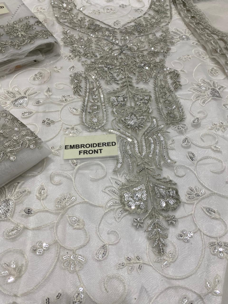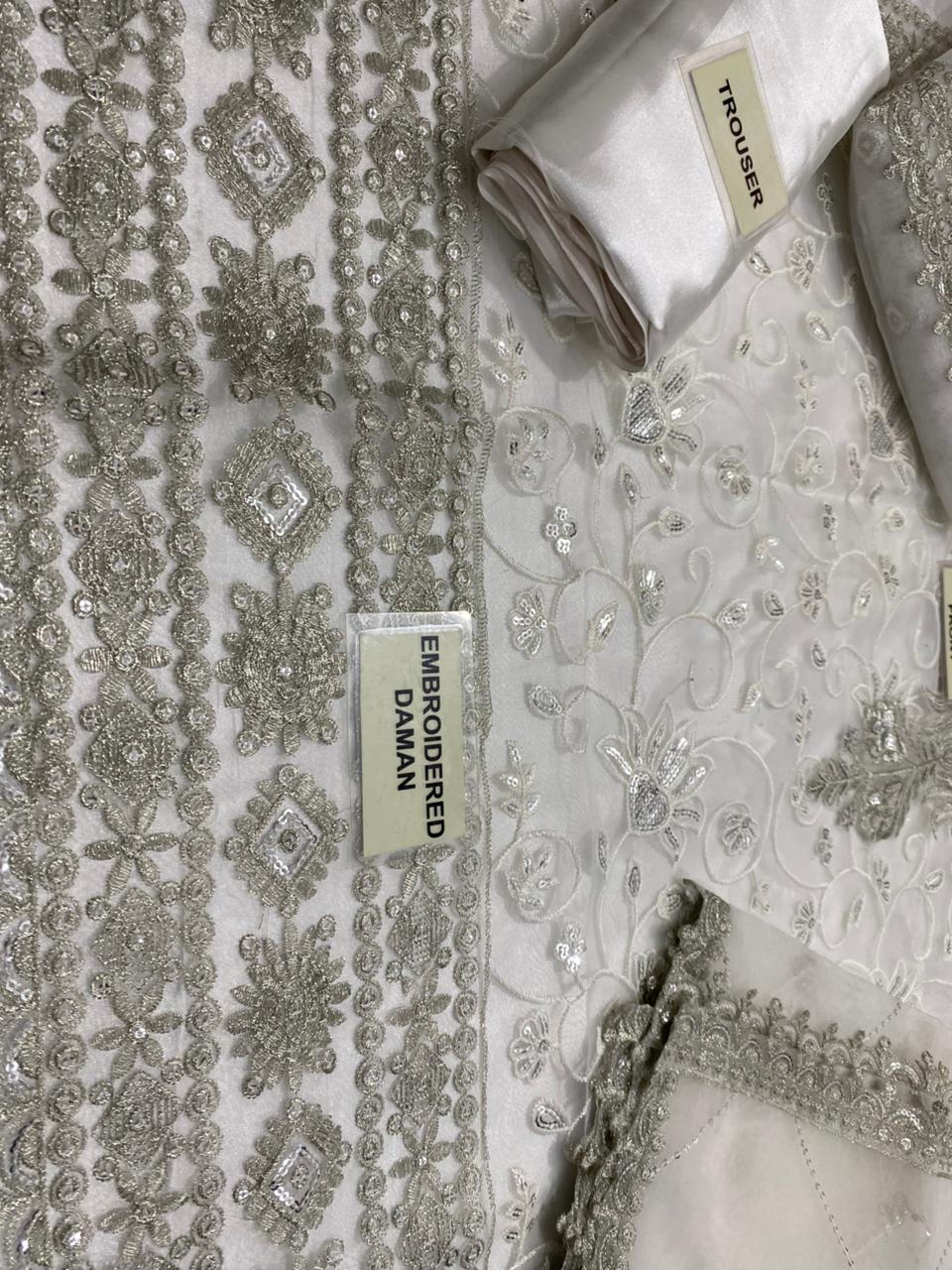 This beautiful Asim Jofa outfit comes in a premium white color with a full organza shirt, organza embroidered dupatta, and soft satin trouser. The shirt features a fully embroidered front with alternate embroidered daman, two side chaak bunches, an embroidered neckline, and an embroidered back with daman. The sleeves are embroidered with a stylish border. The dupatta is fully embroidered and ready to wear. A perfect choice for parties, weddings, and formal events