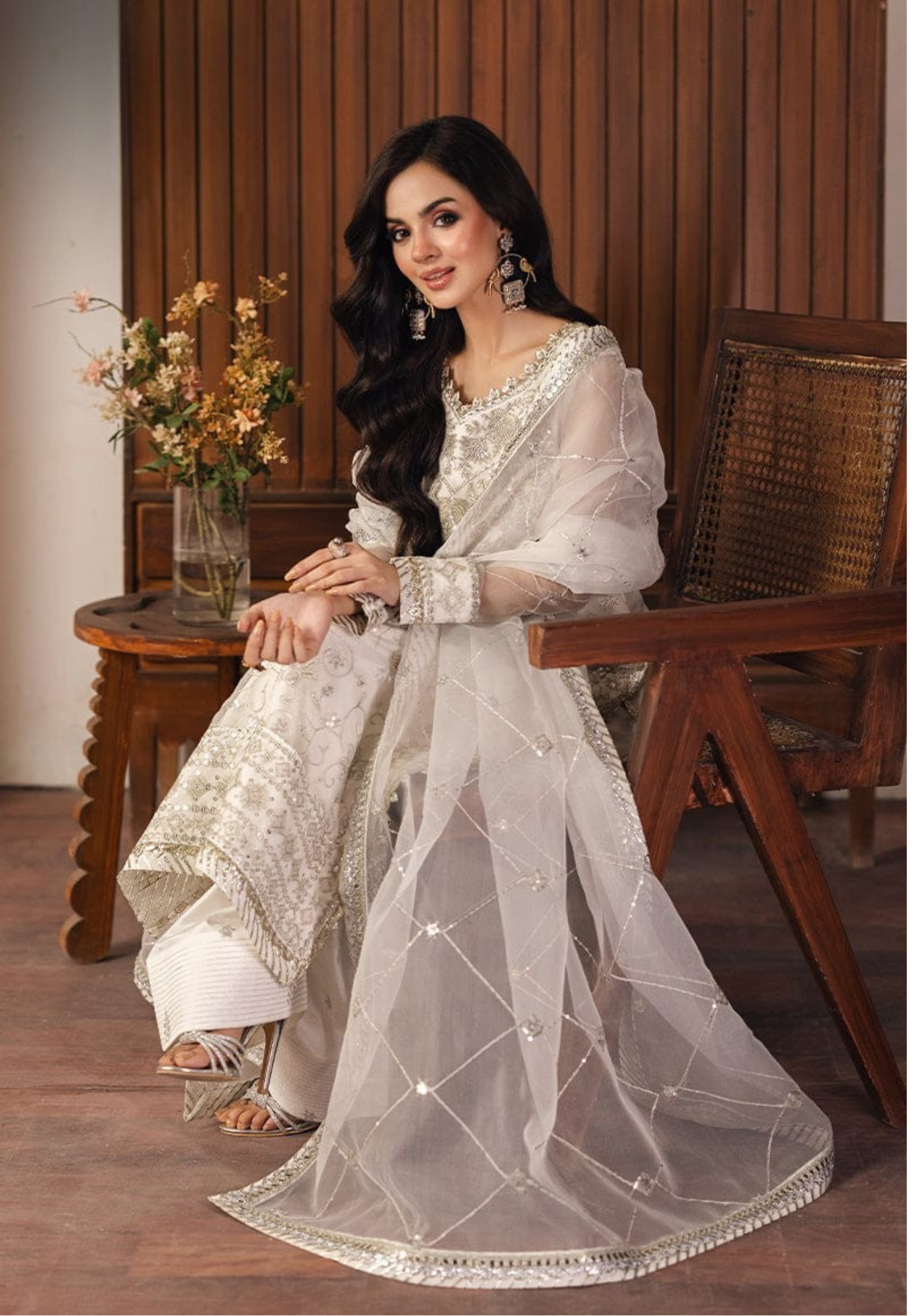 Asim Jofa white organza suit with embroidered shirt, embroidered organza dupatta, and satin trouser. Elegant and premium design.