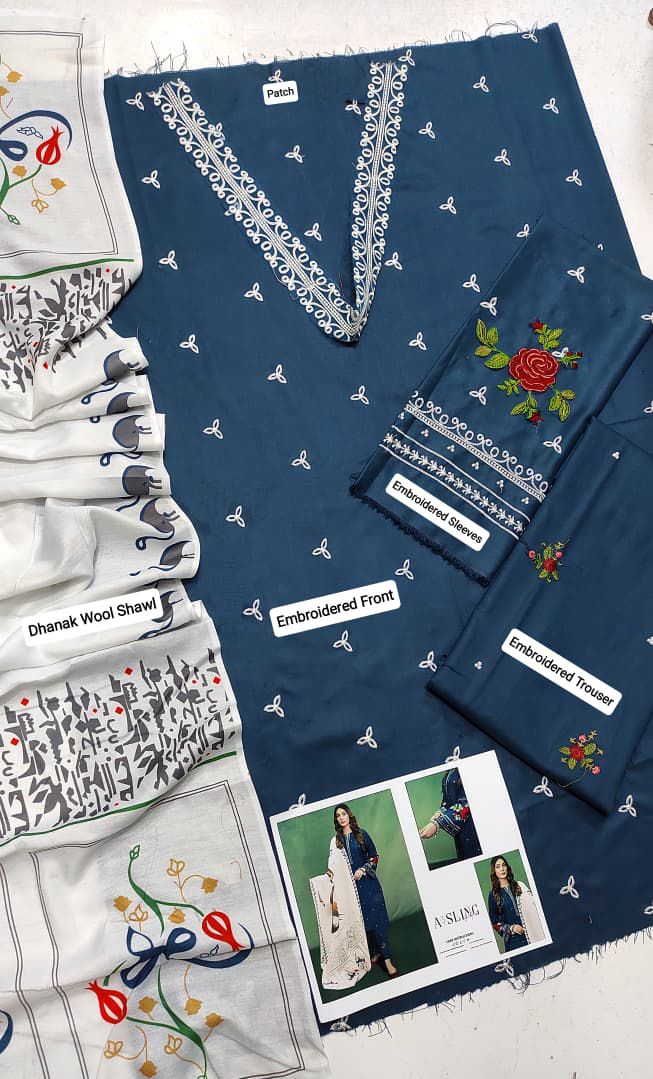 New Arrival! Asling Winter Dhanak Collection 2025-2026 brings premium warmth, comfort, and style. This 3PC embroidered suit is made with Air-Jet Dhanak fabric for a soft winter feel. The front features an embroidered patch, the daman comes embroidered or plain, sleeves are fully embroidered, and the back is plain for a neat finish. The plain trouser adds comfort, while the shawl comes in elegant embroidered or printed wool for a classy winter look. Retail price PKR 5299, now available for just PKR 3500.